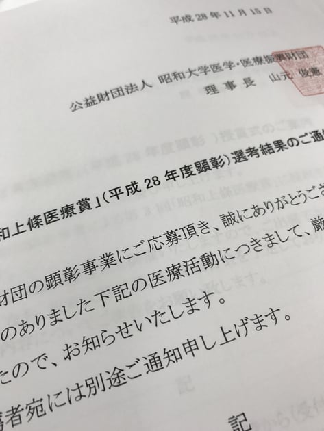 平成28年度の「昭和上條医療賞」に応募したところ